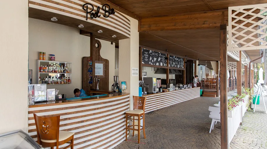 Благодаря наличию данного заведения, у отдыхающих есть возможность наслаждаться вкуснейшими коктейлями прямо в бассейне и возле него.